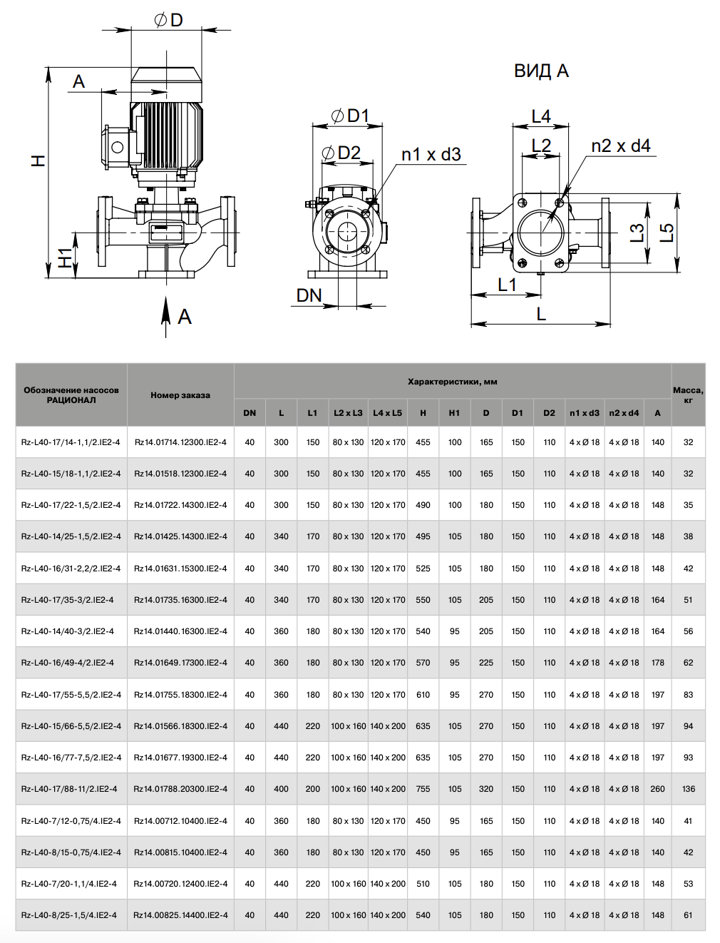 Rz-L DN 40 – 1450 об/мин Габаритные размеры и масса насосов Rz-L DN 40